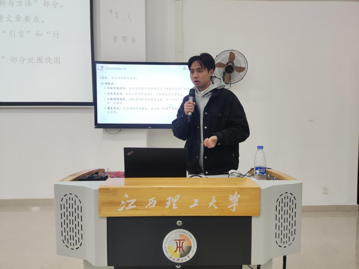 赖俊全博士围绕“SCI 论文写作与投稿”展开分享,结合自己在《Minerals Engineering》等期刊发表论文的案例,系统讲解了论文结构搭建、讨论部分“正三角形”逻辑展开、审稿意见回应等关键环节。他通过具体的审稿意见回复案例,直观展示了如何有理有据回应质疑、补充实验数据,为在场学子提供了可直接借鉴的学术写作方法论。