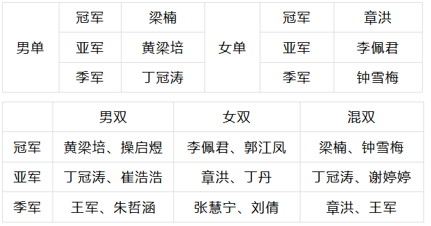 本次比赛设置男单、女单、男双、女双、混双五个竞赛项目,各项目均评选冠、亚、季军奖项。赛事分阶段有序推进,12月6日率先开展男单、女单预赛,12月7日进行男双、女双及混双预赛,经过多轮比拼,晋级选手于12 月14日展开各项目决赛的巅峰对决。